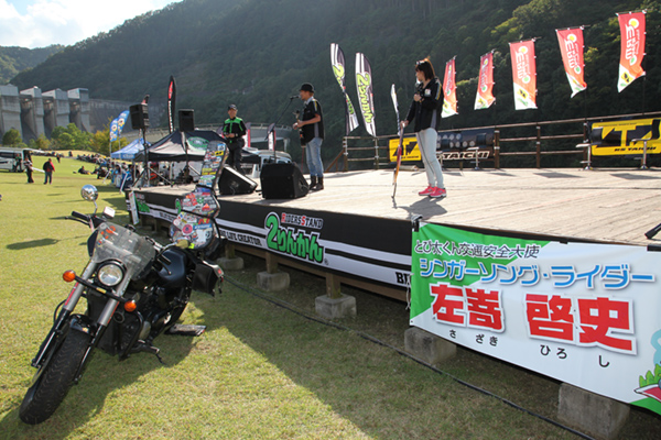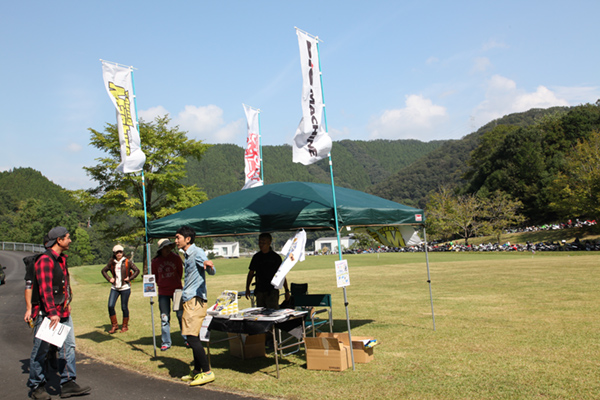 日吉ダムの傍らにある芝生広場は、秋の空気を色濃く感じられます。当日は素晴らしい好天に恵まれました! 昼間は半袖でちょうど良いくらいでしたが、「やっぱり秋ですよ。朝はちょっと寒かったですし」と秋のツーリングを満喫できる気候でした。「昨年の天気と半々にしてくれれば良かったのに」という参加者の言葉に、妙に納得させられました。とにかく「晴れて良かった」がスタッフにとってもご参加いただいた方にとっても本音。青空の下でイベントは開催され、多くのライダーが集結してくださいました。
